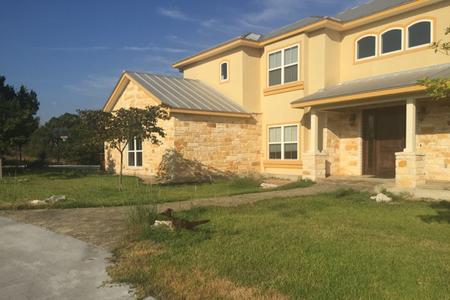 This job displays a basic but popular design which includes long sweeping curved beds bordered with chop-stone mortared end to end. The landscape also includes a common use of river rock accents and native hill country boulders added for interest. The plants used are deer resistant including flowering perennials and native grasses. Dark brown native, finely shredded native mulch is used a a top-dressing about 4" inches thick, not only aesthetic appeal but weed control as well. Existing El Toro Zoysia turf grass is kept in the interior for a restful compliment to the busyness of beds.
